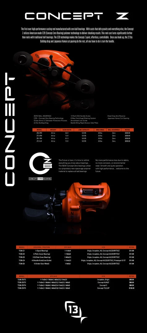 - The 13 Fishing Concept Z Baitcast Fishing Reel is the first ever high-performance casting reel with 0 ball bearings.