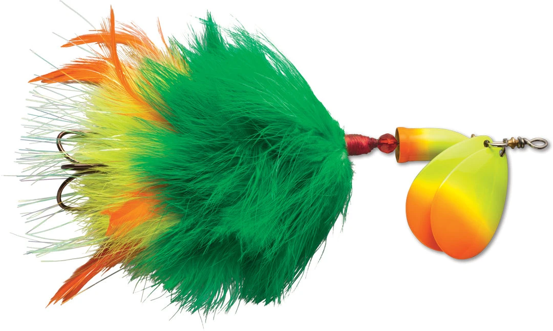 Blue Fox Vibrax Super Bou Twin Blades is a large inline spinner designed to attract muskie and withstand their fierce, toothy strikes. This lure combines marabou, hackle and flashabou fibers to create an undulating action that makes the bait look alive. This spinner is built with durable stainless steel to handle powerful muskie strikes. Equipped with premium VMC hook and durable stainless steel through wire construction. The size 8’s small sleek design is rigged with one hook and is great for burning over shallow cover. The two treble hook size 10 has a larger profile body which emulates mature bait mid-season. Available in 7 colors.
