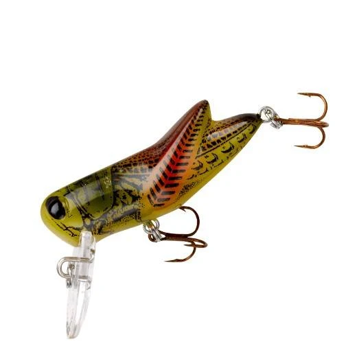 The Rebel Crickhopper Ultralight Waking Crankbait is a 1 1/2 inch ultralight, cricket imitating waking crankbait. This can be used as a topwater or a crankbait and is a great choice for summer and fall bass, trout and other gamefish. With its realistic grasshopper design, the lure imitates a drowning grasshopper when twitched on top, just asking to be snapped up by a lurking bass or panfish. For trout anglers, a straight medium retrieve proves effective in dam and reservoir tailraces or lakes. Comes with super-realistic paint jobs that accurately mimic a real grasshopper. Available in 8 colors.