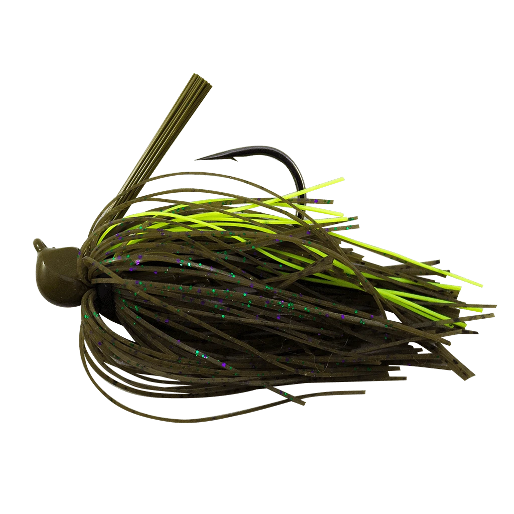 The Fish Head ProSeries M1 Casting Jig is a skirted bass jig. Offering anglers a hybrid jig design, this bass jig delivers the benefits of multiple jigs all rolled into one. Equipped with a medium-heavy fiber weedguard that protects the heavy wire 4/0 Mustad Ultra Point hook from snagging. It gives all the advantages of a casting, football, skipping, and standup style jig in one great lure. Available in 7 colors and 2 weights.